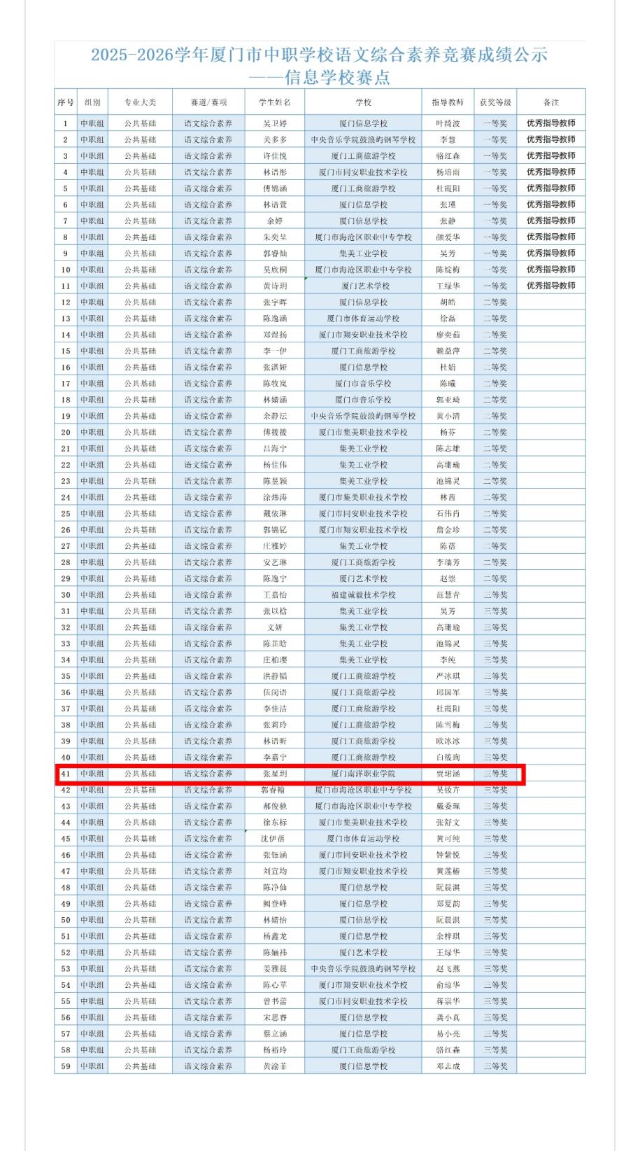 近日,由厦门市教育局、市教科院(职教中心)联合主办的 2025-2026 学年厦门市职业院校技能大赛圆满落幕。作为首次参与该项赛事的队伍,学院参赛选手W24学前教育班张星玥在语文综合素养学生竞赛中斩获三等奖,为学校赢得了荣誉,也为我校技能人才培养成果增添了亮眼一笔。