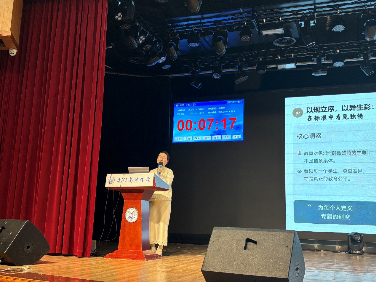 为积极响应学校“书香南洋・阅读启智”系列活动,营造爱读书、读好书的校园风尚,2026年1月14日下午,在创业活动中心礼堂举行了《爱与适合的教育》“共读一本书”读书分享会。本次活动以“共读促共鸣,交流启智慧”为主线,通过心得分享与思想碰撞,引导教师从共读走向共研,从阅读中汲取育人智慧。